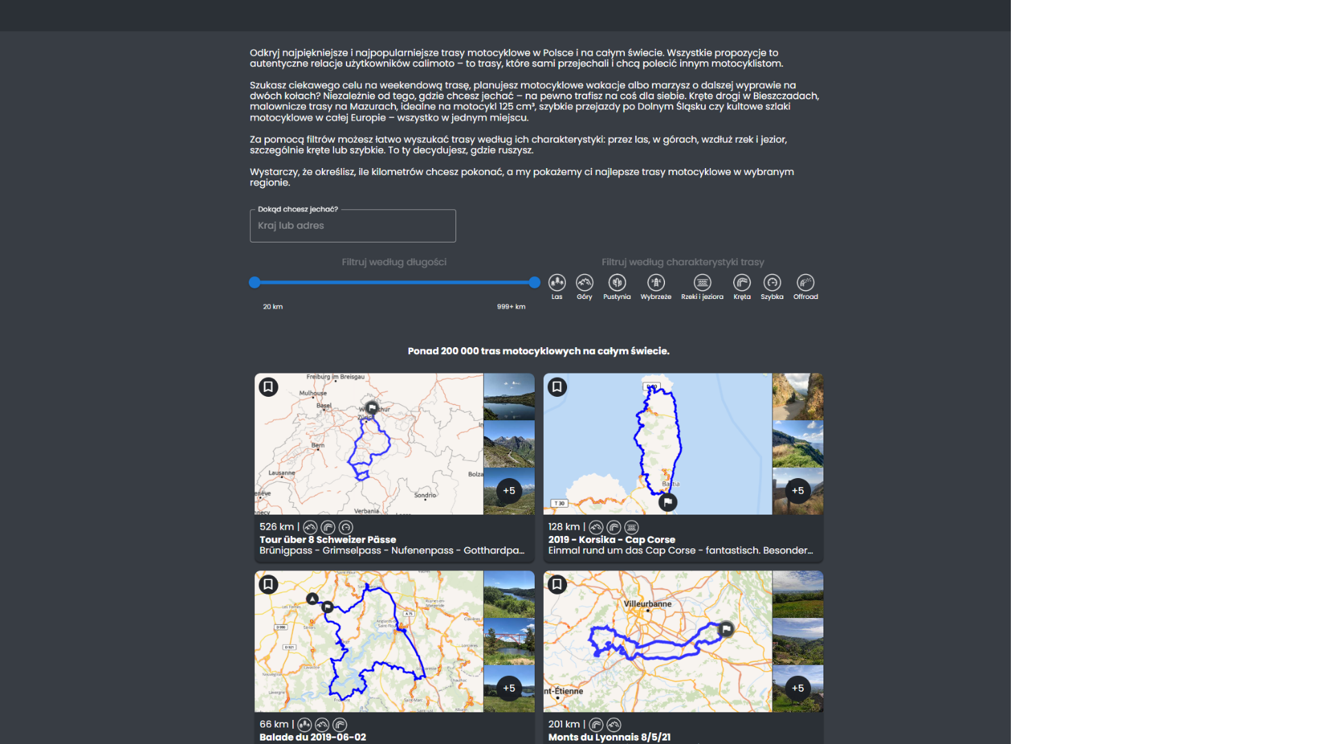 Możliwość podglądania tras innych użytkowników wraz ze zdjęciamiDzięki tym funkcjom możesz dzielić się swoimi przejazdami, odkrywać nowe drogi i czerpać inspiracje od innych motocyklistów.